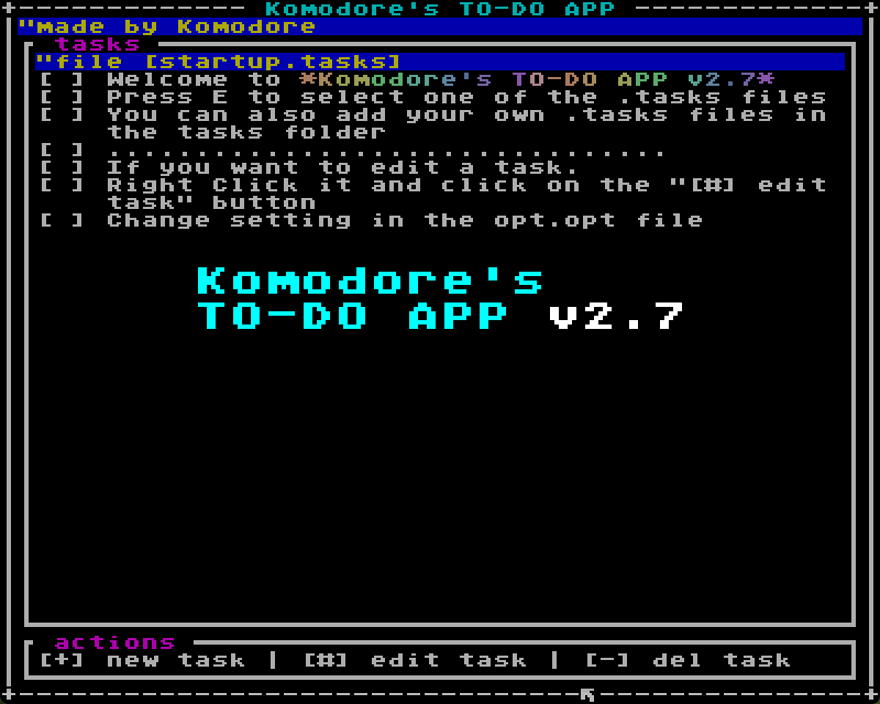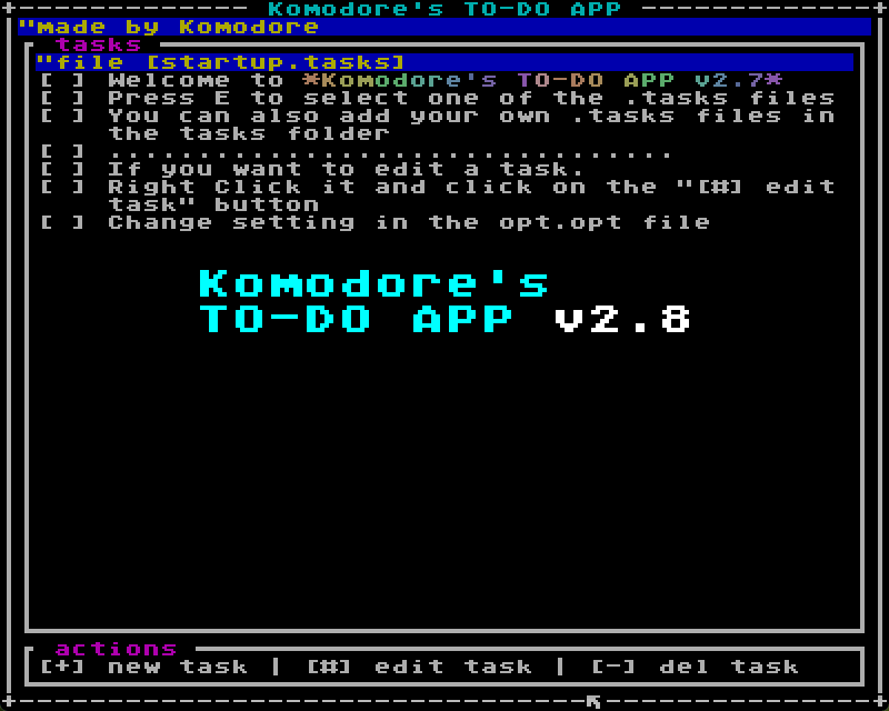 - November 19, 2023 by Komodore's Store#komodore, #task, #management, #organisation, #todo, #tool, #pixel, #8-bit, #retro, #80'sKomodore's TO-DO APP 2.2 Update Today, new bugs have been fixed and new features have been added: Changes: Scrolling Add to display more tasks. Use the Arrow Keys to navigate in the tasks frame if you... Continue reading